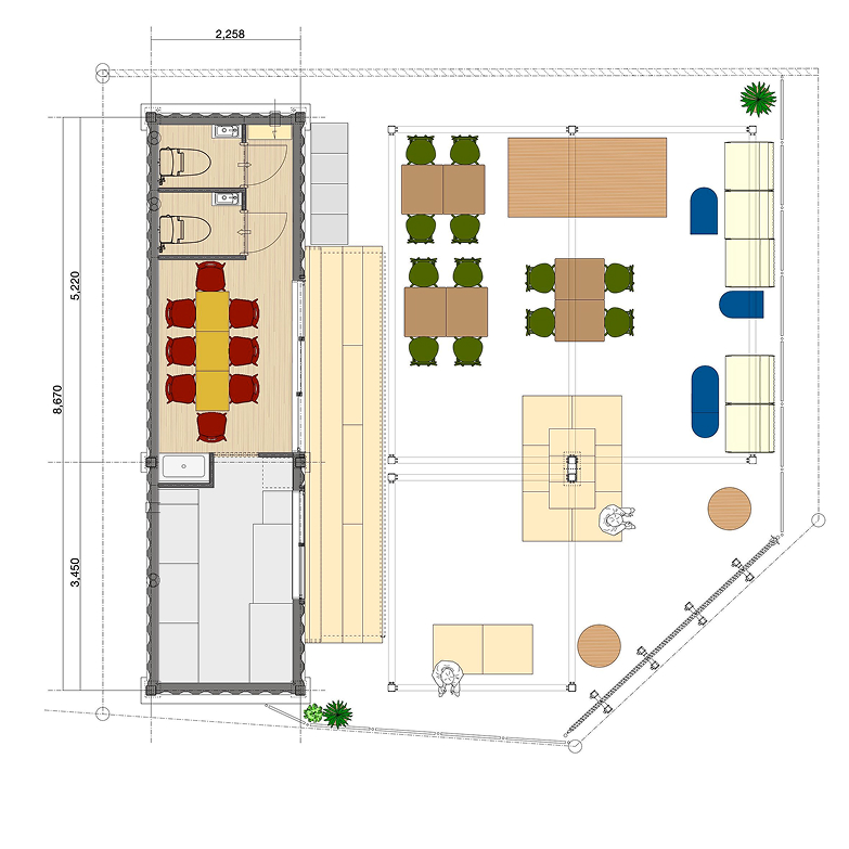 屋内コンテナ(10㎡) エアコン/キッチン完備 屋外テラス(90㎡) 日除パーゴラ完備 -